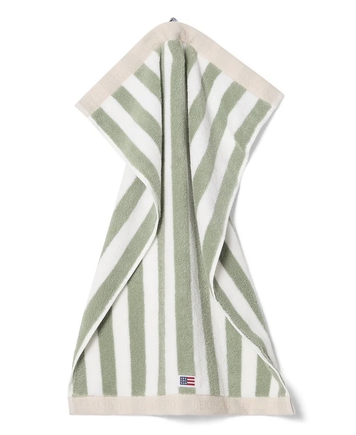 Det klassiske blokkstripete håndkleet fra Lexington i vintage grønn, hvit og moonbeam gir en frisk, tidløs estetikk til badet ditt. Laget av 100% høykvalitets 600g ringspunnet bomullsfrotté, er dette håndkleet både mykt og svært absorberende. Det sofistikerte blokkstripede designet har en brettet kontrastkant med jacquard-tekstlogo på topp og bunn, mens en vevd Lexington-logo nederst foran gir et autentisk preg. Oeko-tex-sertifisert for din trygghet.