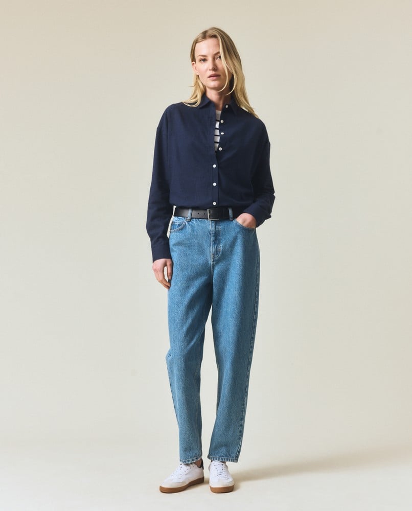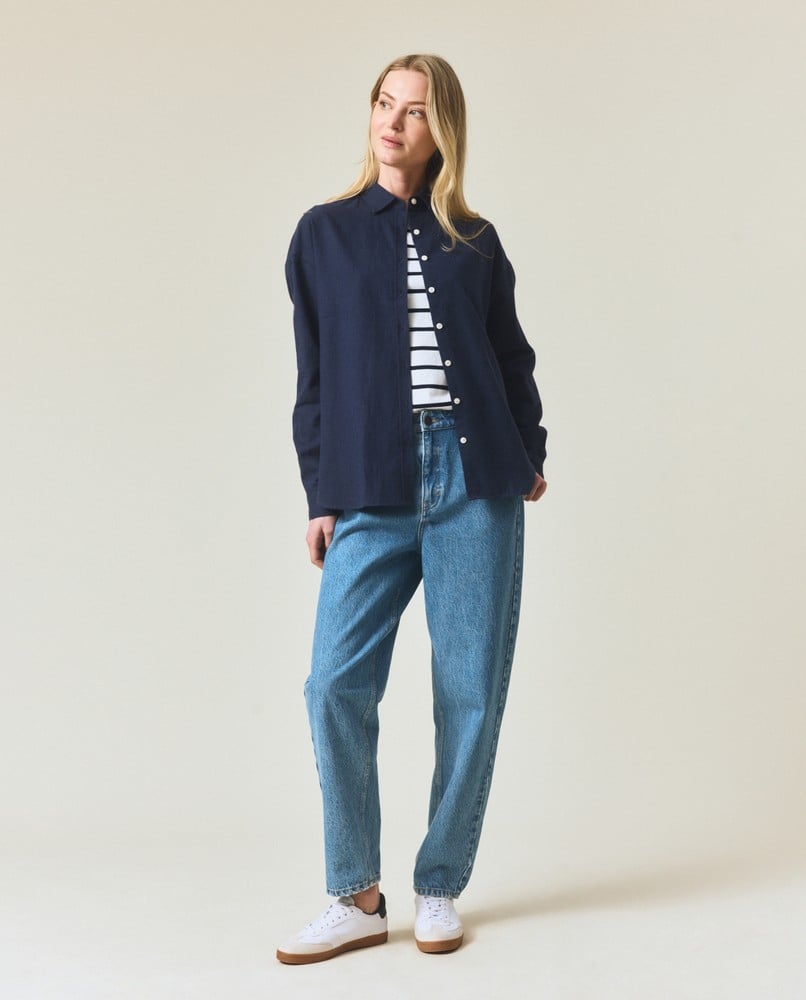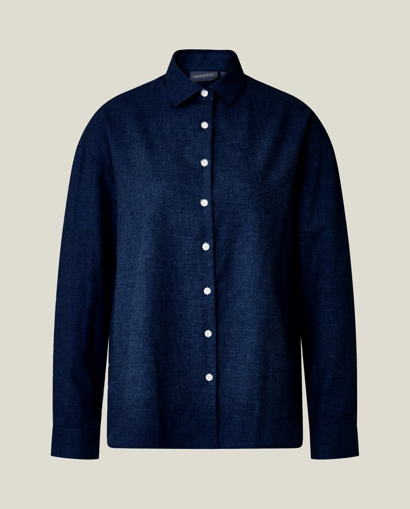 Gjennomtenkt designet med lange ermer, senkede skuldre og en avslappet casual fit som sikrer bevegelsesfrihet gjennom hele dagen. Skjorten har elegante, skinnende hvite perlimitasjonsknapper gjennom fronten, som tilfører et raffinert preg til dette avslappede plagget. Et signatur Lexington-flaggmerke på sidesømmen fullfører utseendet med vårt kvalitetsstempel.