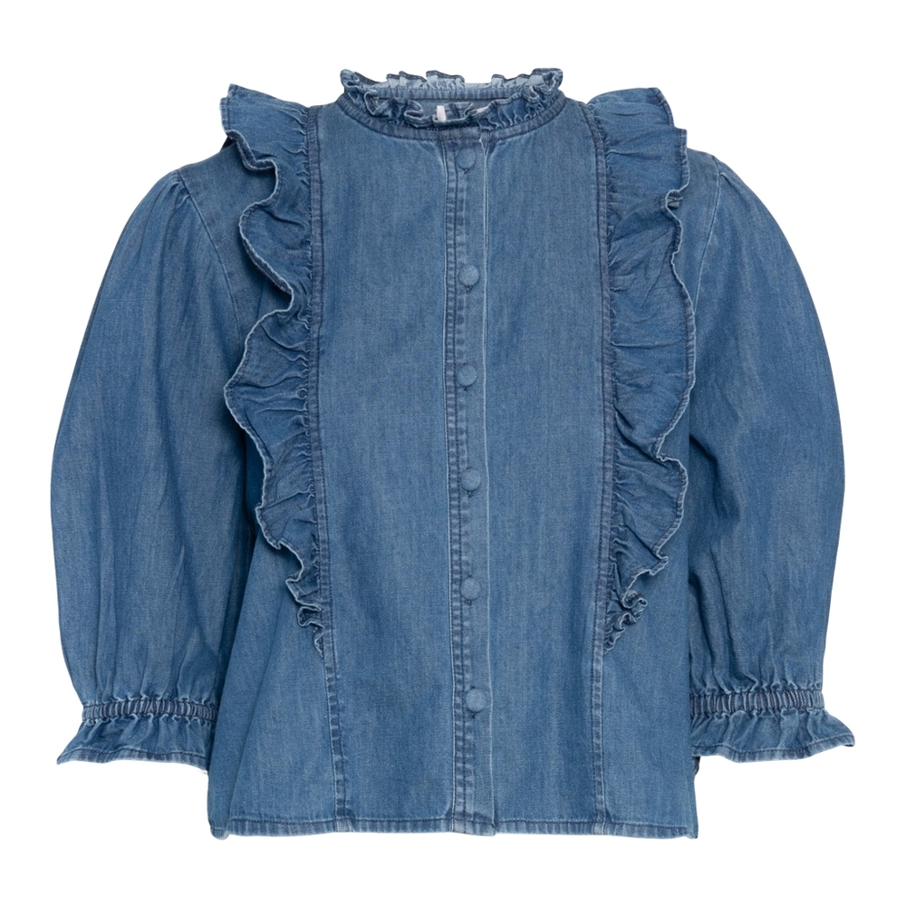 En klassisk denimbluse fra Rah Oslo med et romantisk preg. Modellen har volangdetaljer langs fronten, rund hals og lange ermer med elastisk avslutning. Den rette passformen gjør den enkel å style både til skjørt og bukser.
