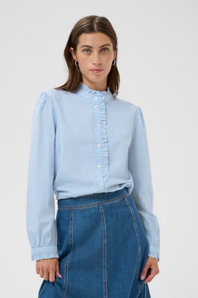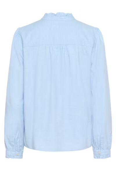Denne skjorten fra Part Two er laget i et mykt bomullsstoff med fine volangdetaljer langs knappestolpen og en høy krage som gir et romantisk uttrykk. Ermene avsluttes med elastiske mansjetter. Bruk den med jeans eller skjørt for en avslappet, men feminin stil.