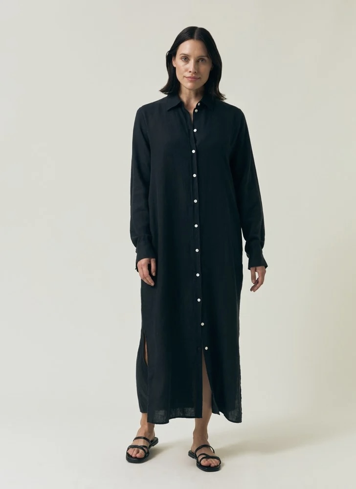Denne lange skjortekjolen i lin fra Lexington har en tidløs og allsidig stil. Den har lange ermer, knappelukking foran og praktiske sidelommer. Slissene i siden gir god bevegelsesfrihet, mens et avtakbart belte i midjen gjør det mulig å tilpasse stylingen. En diskret etikett i sidesømmen gir en ekstra detalj. Denne kjolen er perfekt til både uformelle og pyntede anledninger, og kombinerer komfort med uanstrengt eleganse.