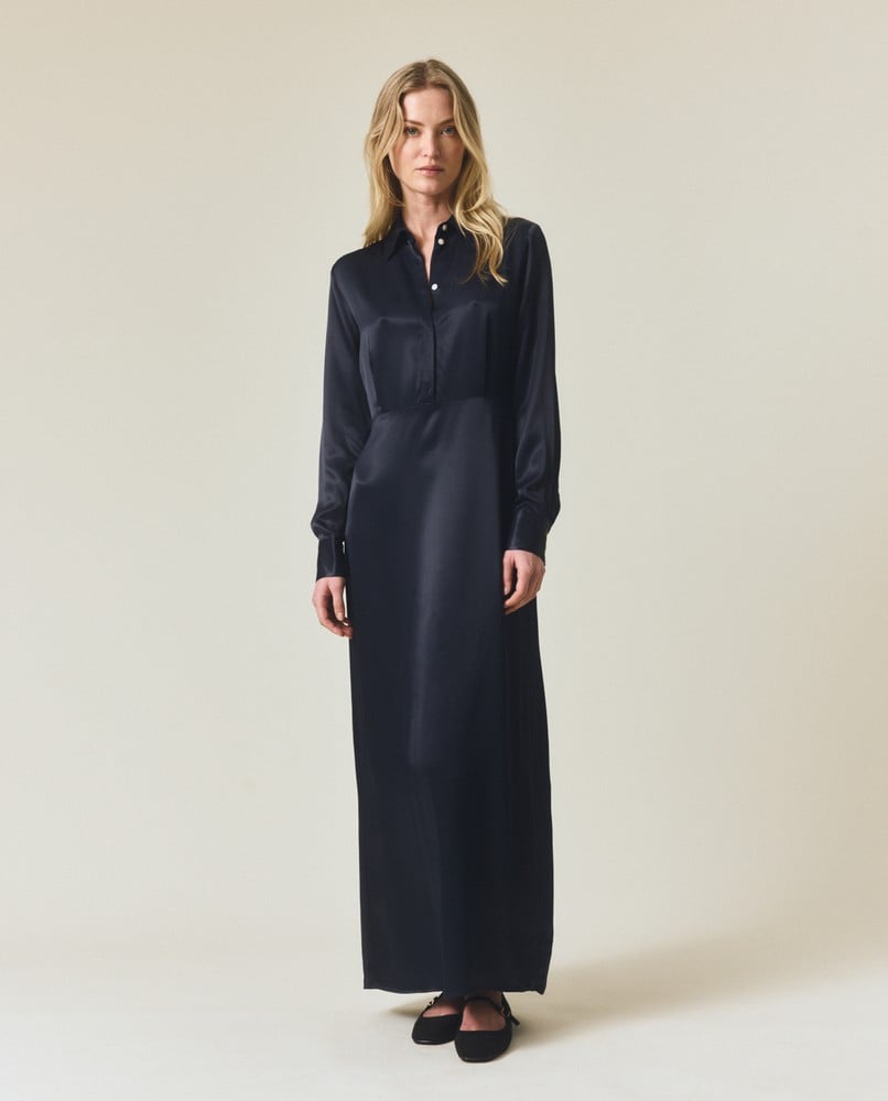 Oppgrader garderoben din med Lexingtons Maxi Satin Shirt Dress, et tidløst plagg som enkelt tar deg fra dag til kveld. Laget av en luksuriøs blanding av viskose og rayon med en glansfull satengfinish, faller denne hellange kjolen vakkert samtidig som den beholder sin klassiske skjortekjolesilhuett. Den skjulte knappestolpen skaper en strømlinjeformet front, mens gjennomtenkt plasserte plisseringer og innsnitt fremhever den feminine formen. Den har raffinerte detaljer som elegante ermemansjetter med knappelukking og en praktisk glidelås på siden for enkel bruk. I en allsidig mørkeblå marinefarge passer dette plagget perfekt med både casual flate sko til hverdags eller med prangende smykker og hæler til mer formelle anledninger.