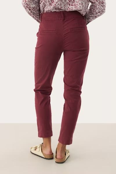 Disse burgunderrøde buksene fra Part Two i en lett stretch-bomullsblanding har en flatterende, rett passform og litt kortere benlengde. Med skrå lommer og beltehemper gir de et avslappet og anvendelig uttrykk. Style med en mønstret skjorte for en sofistikert hverdagsstil.