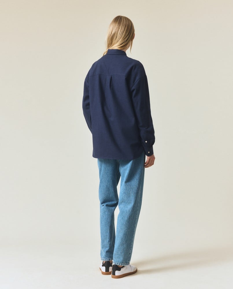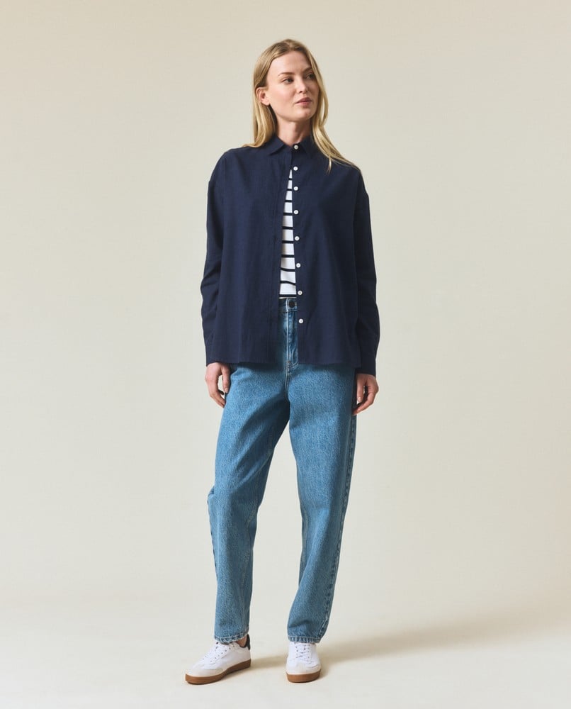 Gjennomtenkt designet med lange ermer, senkede skuldre og en avslappet casual fit som sikrer bevegelsesfrihet gjennom hele dagen. Skjorten har elegante, skinnende hvite perlimitasjonsknapper gjennom fronten, som tilfører et raffinert preg til dette avslappede plagget. Et signatur Lexington-flaggmerke på sidesømmen fullfører utseendet med vårt kvalitetsstempel.