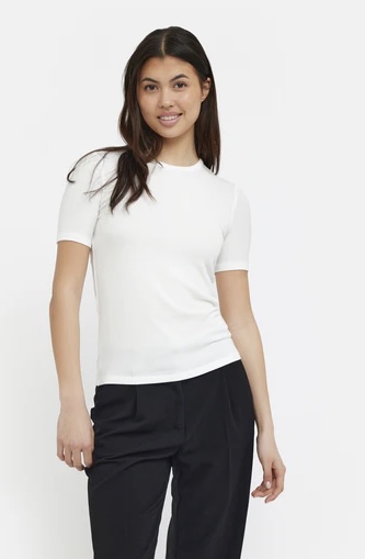 Kortermet topp fra Soft Rebels. Laget i et mykt modalstoff i ribbestruktur og laget med en o-hals. Den perfekte hverdagstoppen - par den med jeans og sneakers for en casual look eller under en blazer. Full lengde er 61 cm i størrelse S.