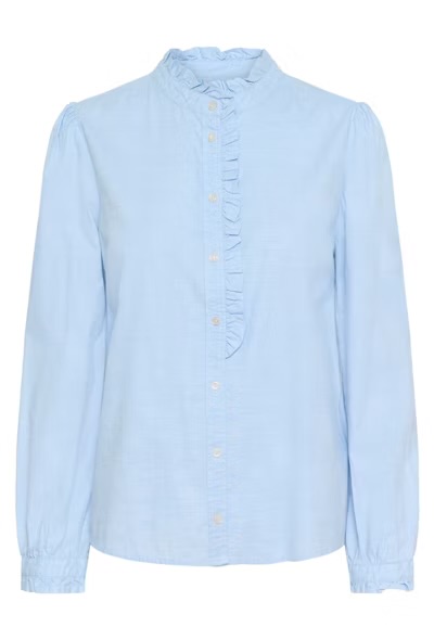Denne skjorten fra Part Two er laget i et mykt bomullsstoff med fine volangdetaljer langs knappestolpen og en høy krage som gir et romantisk uttrykk. Ermene avsluttes med elastiske mansjetter. Bruk den med jeans eller skjørt for en avslappet, men feminin stil.