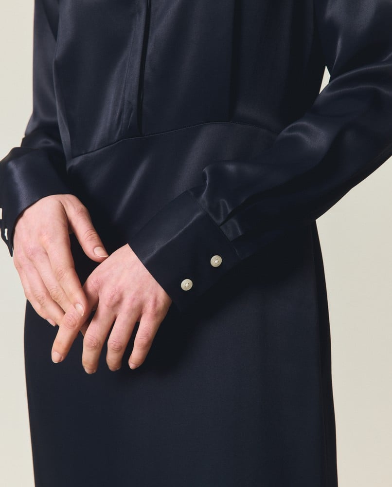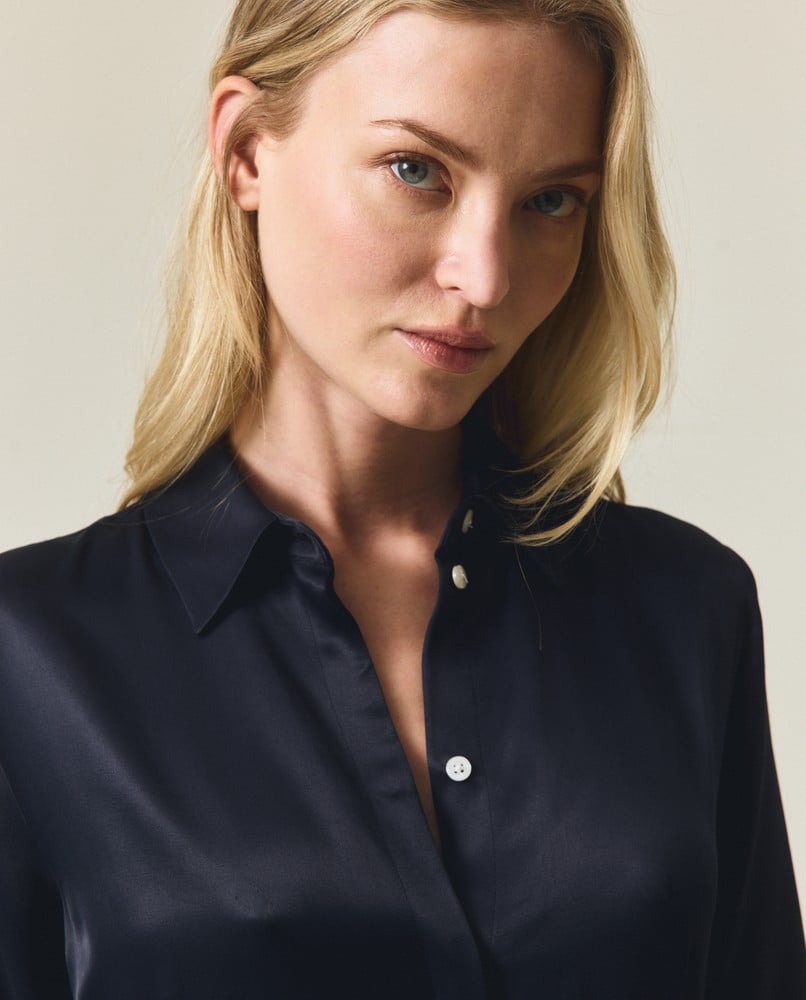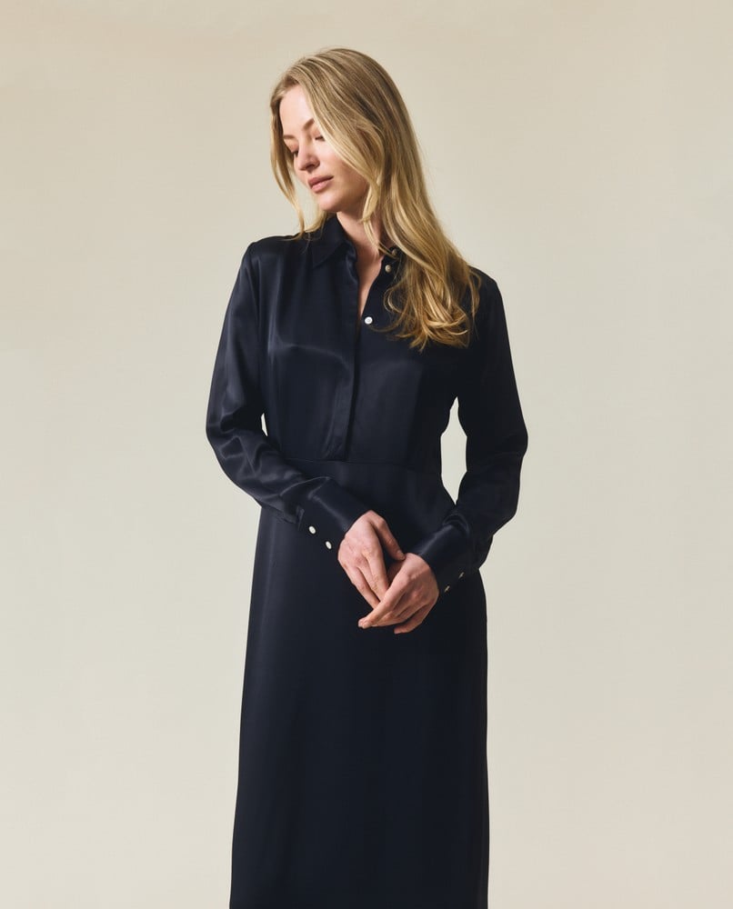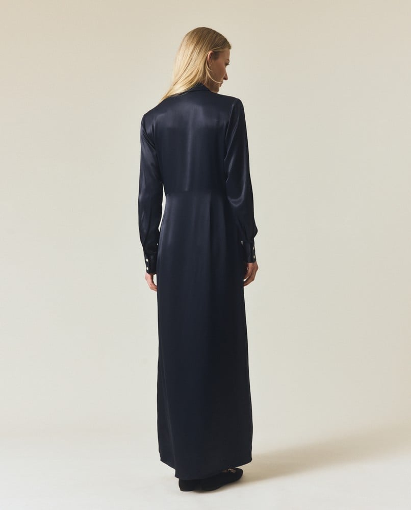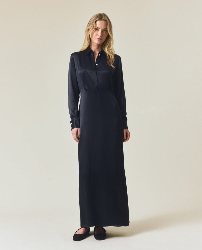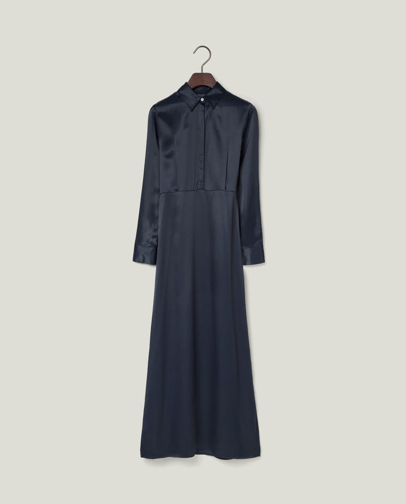 Oppgrader garderoben din med Lexingtons Maxi Satin Shirt Dress, et tidløst plagg som enkelt tar deg fra dag til kveld. Laget av en luksuriøs blanding av viskose og rayon med en glansfull satengfinish, faller denne hellange kjolen vakkert samtidig som den beholder sin klassiske skjortekjolesilhuett. Den skjulte knappestolpen skaper en strømlinjeformet front, mens gjennomtenkt plasserte plisseringer og innsnitt fremhever den feminine formen. Den har raffinerte detaljer som elegante ermemansjetter med knappelukking og en praktisk glidelås på siden for enkel bruk. I en allsidig mørkeblå marinefarge passer dette plagget perfekt med både casual flate sko til hverdags eller med prangende smykker og hæler til mer formelle anledninger.
