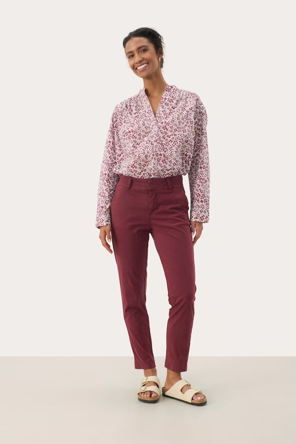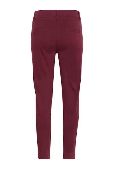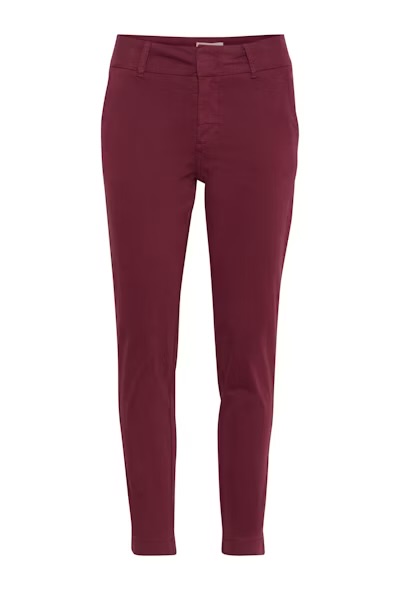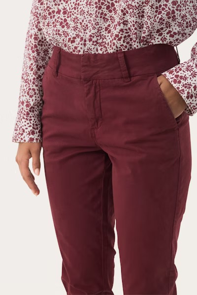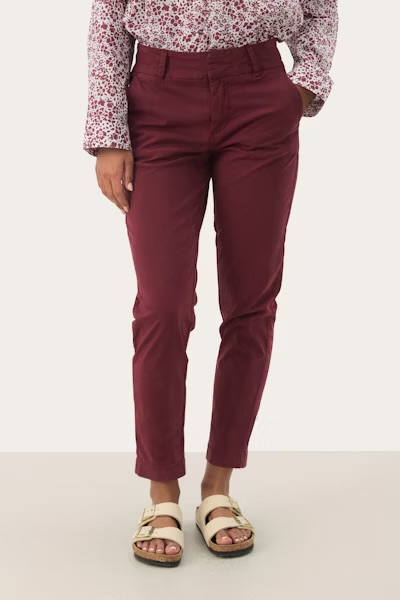 Disse burgunderrøde buksene fra Part Two i en lett stretch-bomullsblanding har en flatterende, rett passform og litt kortere benlengde. Med skrå lommer og beltehemper gir de et avslappet og anvendelig uttrykk. Style med en mønstret skjorte for en sofistikert hverdagsstil.