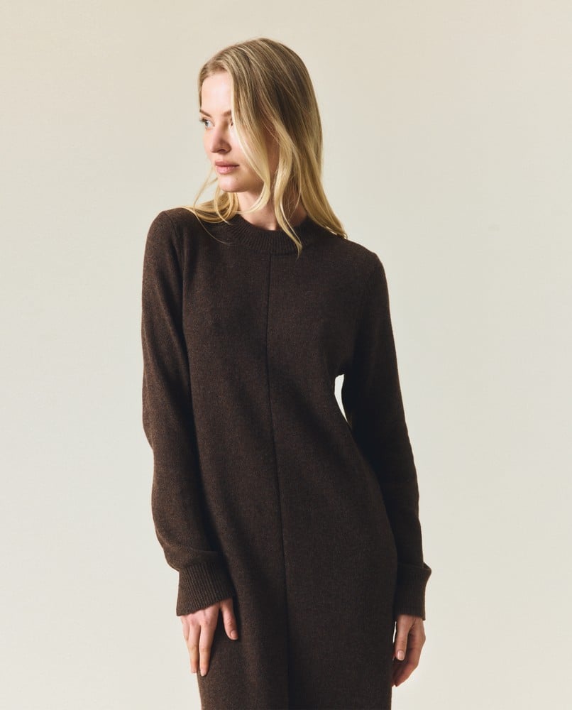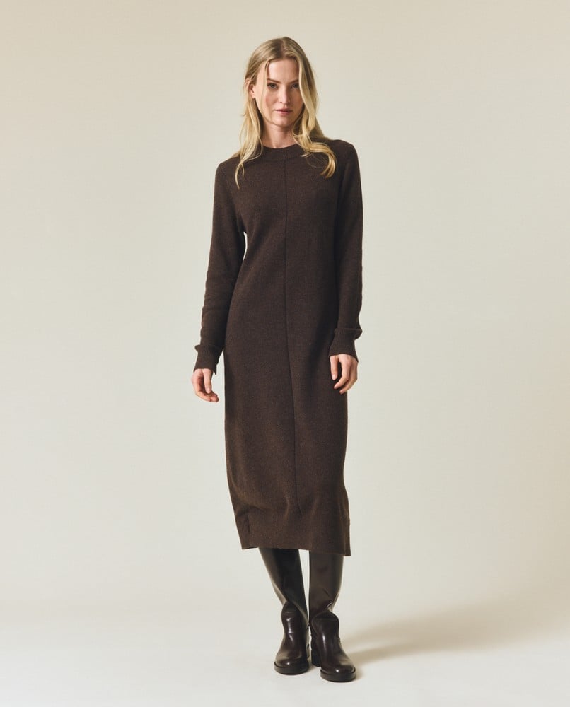 Oppgrader din hverdagsstil med Lexingtons Straight Fit Midi strikket kjole, en perfekt kombinasjon av komfort og sofistikering. Denne kjolen er laget av en førsteklasses blanding av ekstra fin merinoull, økologisk bomull og resirkulert nylon, som gir både varme og bærekraft. Den lysbeige melangefargem skaper et allsidig utgangspunkt for tilbehør, mens gjennomtenkte detaljer som drop needle-søm midt foran og subtile splitter tilfører raffinert visuell interesse. Den casual passformen faller vakkert over kroppen, og ribbelementer ved hals, ermer og nederkant gir struktur og holdbarhet. Kombiner med støvler og et statement-smykke på kjøligere dager, eller kle den ned med sneakers for et mer avslappet utseende - denne midikjolen vil raskt bli en hjørnestein i garderoben din.