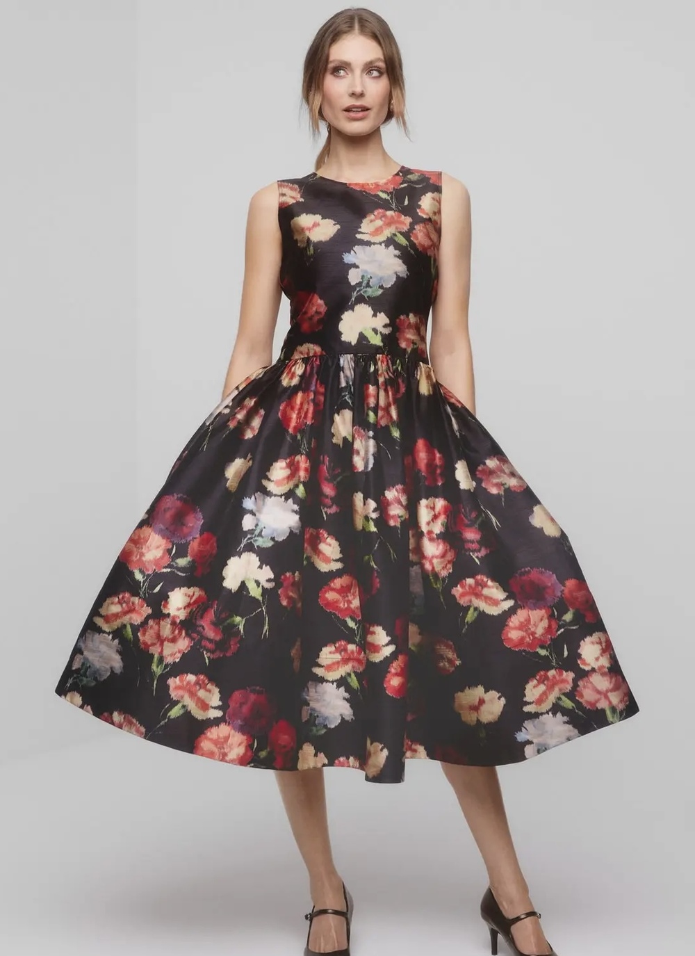Taffeta Midi Dress fra ByTiMo er en sofistikert kjole perfekt for festlige anledninger. Den kommer i sort bunnfarge med et delikat blomsterprint som gir et feminint og tidløst uttrykk. Kjolen har rund hals og er ermeløs, med en smal passform i overkroppen som fremhever silhuetten før den skrår ut i et voluminøst skjørt med elegant midi-lengde. Lukkes med glidelås i ryggen for en ren og enkel finish.