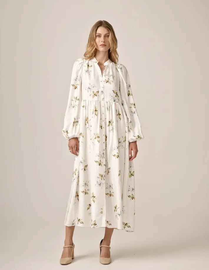 Viscose Relaxed Dress fra by TiMo er laget i en delikat og skinnende blanding av lin og sertifisert viskose. Kjolen har midi-lengde, avslappet passform, lett justert i midjen for strukturen, lange ermer med elastiske mansjetter, mandarinkrage og knapper foran. Kjolen har vakre rynkedetaljer fra midjen og ned, noe som gir en flytende og sjarmerende stil til denne kjolen.